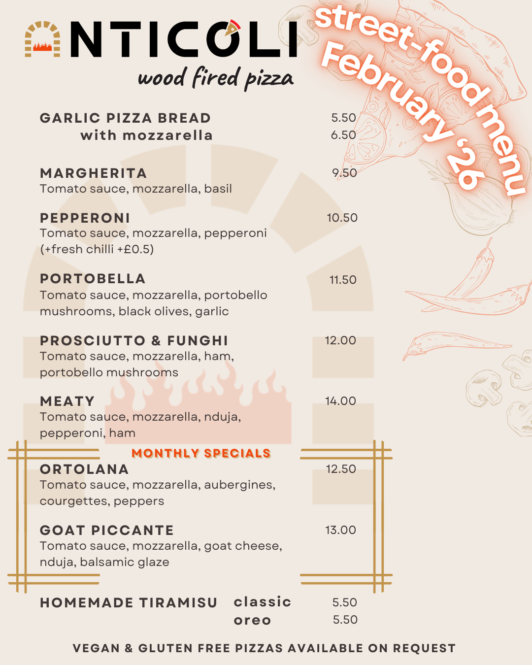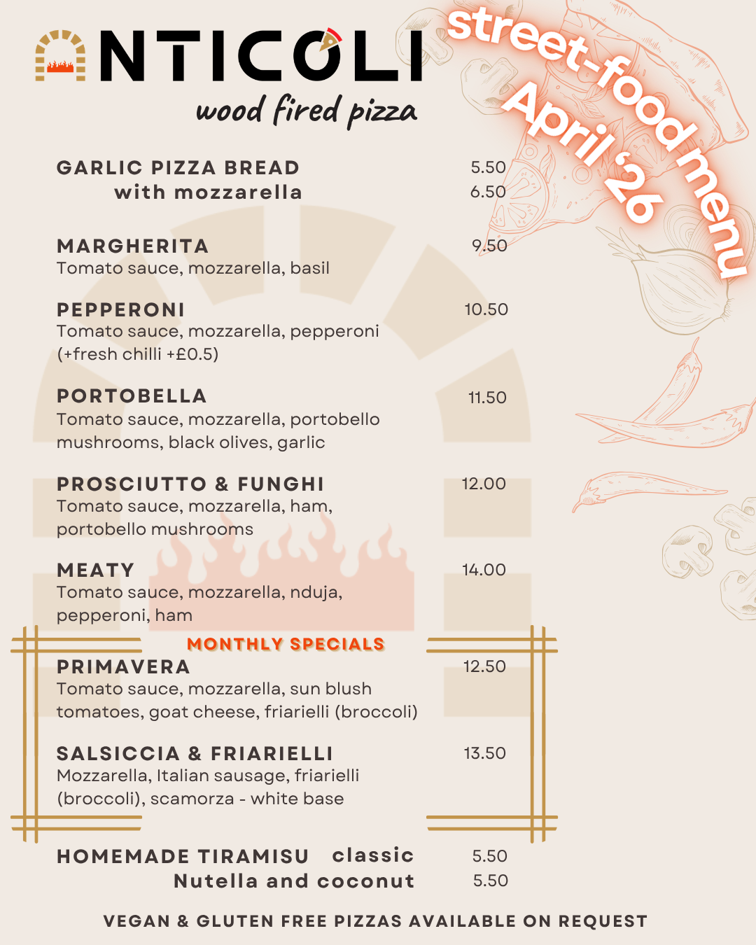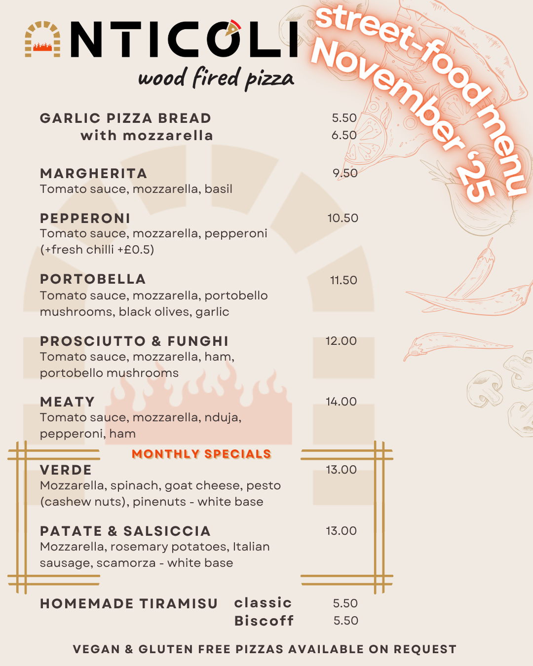 Click below for the latest menu at our weekly street food locations with our mobile pizza vans.